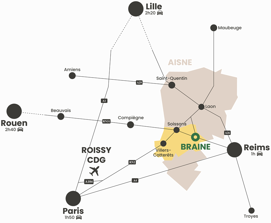 Situé au 21 rue Bailleux à Braine, dans l'Aisne, le château est accessible en moins de deux heures depuis Paris, 1h30 depuis Roissy Charles de Gaulle, à 20 minutes de Soissons et à 40 minutes de Reims.